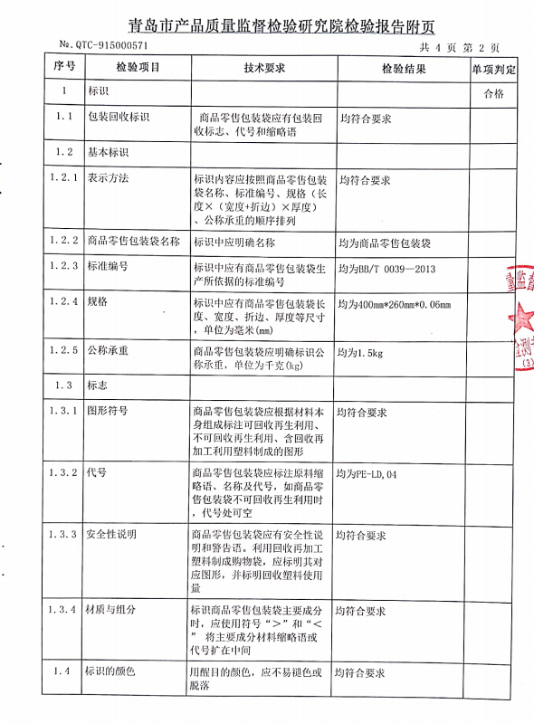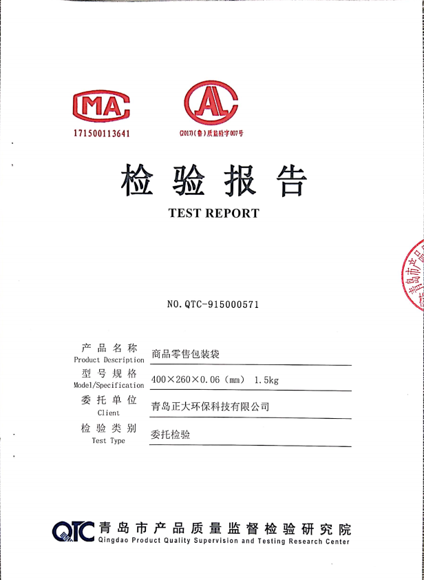 青島正大環(huán)保生產(chǎn)的零售商品包裝袋400*260*0.06mm順利通過青島質(zhì)量監(jiān)督檢查院檢測