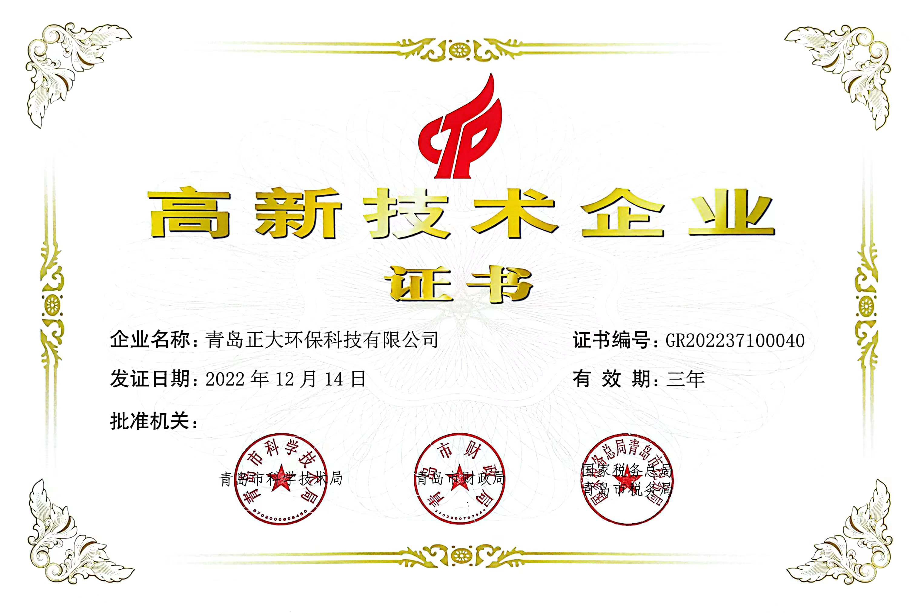 熱烈祝賀青島正大環(huán)保科技有限公司榮獲高新技術(shù)企業(yè)稱號(hào)!